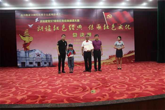 2018年9月1日晚上,“朗讀紅色經(jīng)典 傳承紅色文化”江西燕興物業(yè)管理有限公司慶祝建黨97周年紅色經(jīng)典朗讀大賽總決賽,在贛南賓館會(huì)堂隆重舉行,12個(gè)紅色經(jīng)典節(jié)目從50個(gè)預(yù)賽節(jié)目中脫穎而出,同臺(tái)競(jìng)技,角逐總決賽各獎(jiǎng)項(xiàng)。江西省廣電網(wǎng)絡(luò)公司贛州分公司黨委委員、工會(huì)主席彭光華,贛州市明成國(guó)際旅行社總經(jīng)理羅成等領(lǐng)導(dǎo)嘉賓蒞臨指導(dǎo),燕興物業(yè)董事長(zhǎng)劉燕,總經(jīng)理劉南斗,副董事長(zhǎng)陽(yáng)敏,副總經(jīng)理徐桂香、張衛(wèi)東等公司領(lǐng)導(dǎo),以及公司員工、小區(qū)業(yè)主等200余人在場(chǎng)觀看。