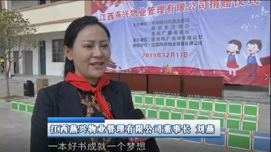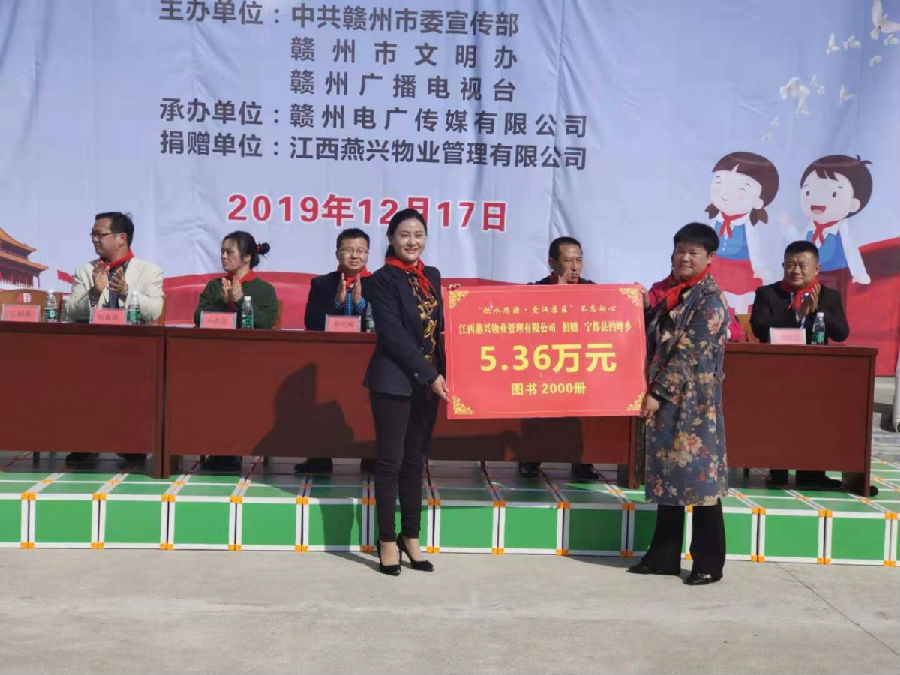 公司董事長劉燕在捐贈儀式上說:“一本好書成就一個夢想,捐贈一本書,奉獻一份愛,希望學校越辦越好,為社會培養出更多更優秀的人才。我們燕興物業將繼續秉承中華民族的傳統美德,飲水思源、感恩社會、回饋社會、不忘初心、繼續關注教育,為助力社會公益事業,關注蘇區發展,盡燕興人的綿薄之力。”