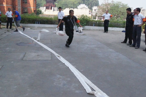 本次比賽項目共分三項內容,第一項:雙人二盤水帶連接滅火;第二項:雙人20米干粉滅火器滅火;第三項消防知識問答題:。當總裁判的號聲吹響,選手們立即進入實戰狀態,由城東片區選派的兩名選手配合默契,只看見一人將水帶拋出后拿住另一端迅速連接地面消防栓口,另一人腰插水槍,手拿另一盤水帶以迅雷不及掩耳之勢向前方奔跑,途中將二盤水帶在接口處旋轉卡接好,又迅速奔跑將二盤水帶拉直并將水槍接好,整體動作干凈利落一氣呵氣好不瀟灑,當裁判哨聲吹響,雙人二盤水帶連接滅火時間僅用時17秒,獲得了場上高聲喝彩聲。比賽進入第二個項目,城南區組成的二人小組上場,只見他們手提滅火器站在20米紅線外,當哨聲吹響,選手們立即提著滅火器向著火處奔來,然后對著火焰的根部噴出白色的氣粉,火瞬間熄滅。當五個片區的選手一一登場獻技后,比賽園滿結束,獲得此次比賽第一名的是城東項目部,獲得第二名的是城南項目部。