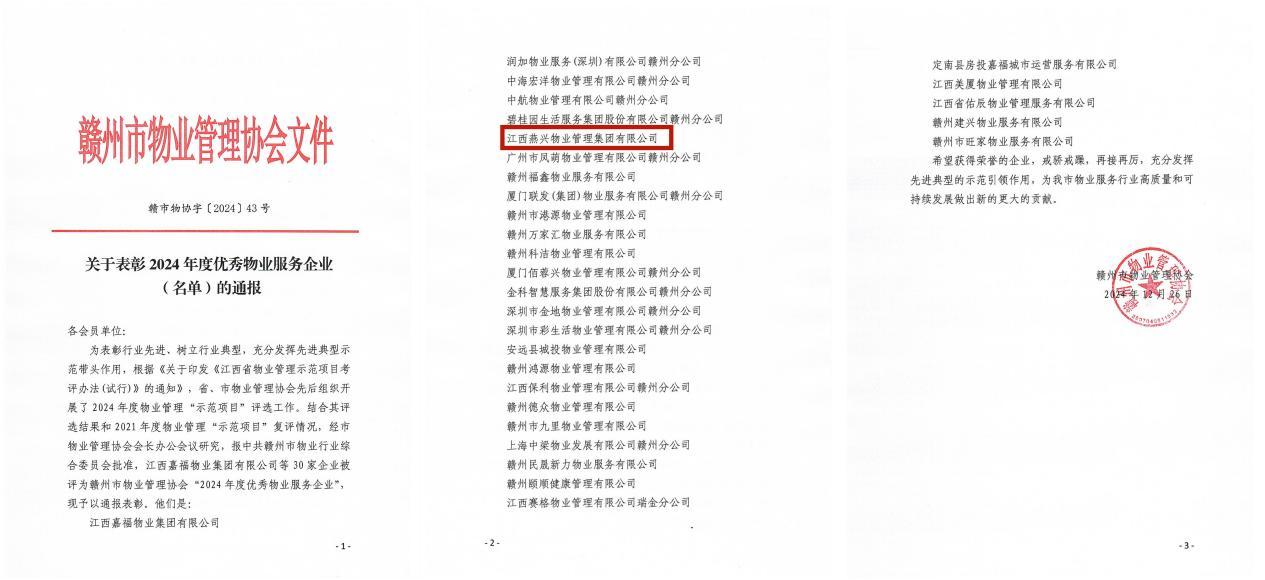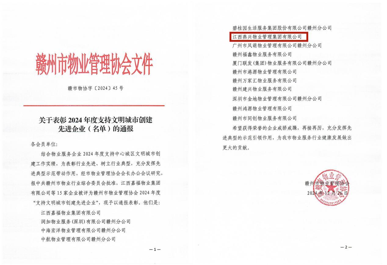 喜報|燕興物業(yè)榮獲“2024年度優(yōu)秀物業(yè)企業(yè)”“誠信自律企業(yè)””支持文明城市創(chuàng)建先進企業(yè)”榮譽稱號