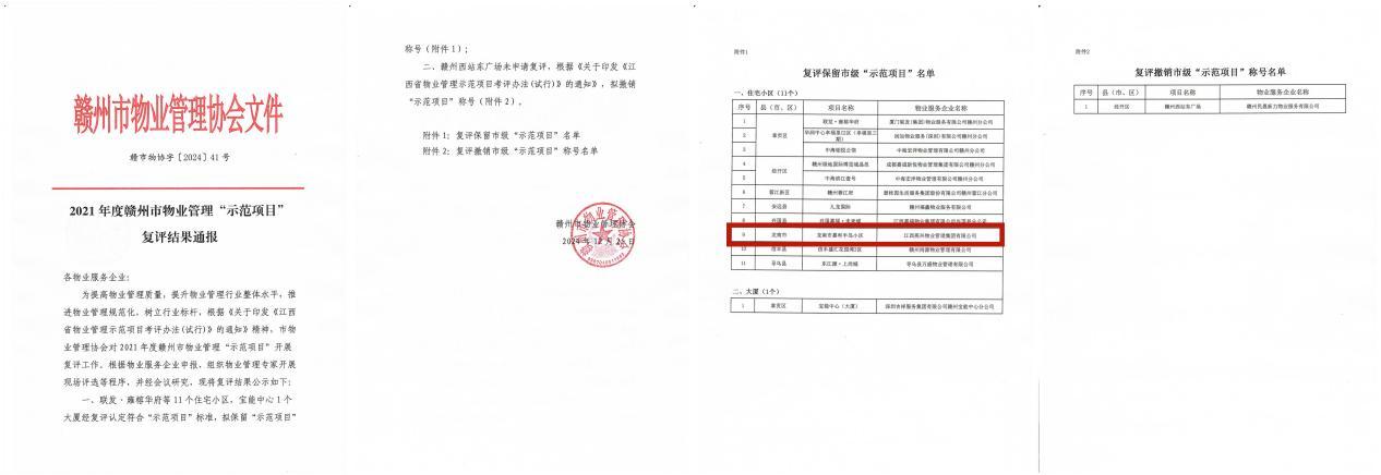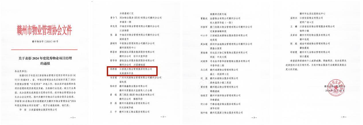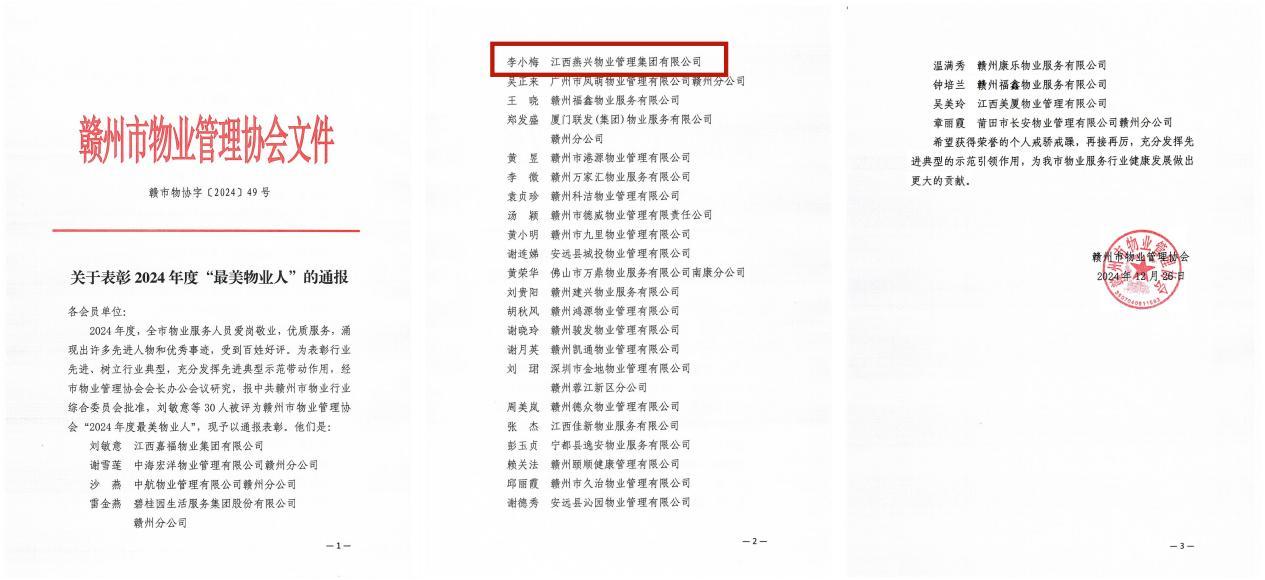2025年元月7日,贛州市物業(yè)管理協會第五屆三次會員大會在贛州市格蘭云天國際酒店勝利召開,會上對2024年度優(yōu)秀物業(yè)企業(yè)及個人進行了通報表彰。燕興物業(yè)喜獲贛州市“2024年度優(yōu)秀物業(yè)企業(yè)”“2024年度誠信自律企業(yè)”“2024年度支持文明城市創(chuàng)建先進企業(yè)”榮譽稱號;龍南嘉和半島小區(qū)復評通過“贛州市優(yōu)秀示范小區(qū)”,項目經理周群蓉喜獲“2024年度優(yōu)秀物業(yè)項目經理”榮譽稱號,公園壹號小區(qū)物管員李小梅獲得“最美物業(yè)人”榮譽稱號。